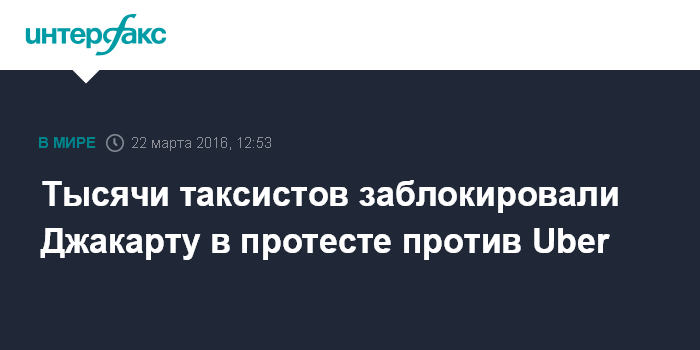 Москва. 22 марта. INTERFAX.RU - Тысячи водителей такси заблокировали улицы Джакарты в знак протеста против онлайн-сервисов по заказу такси, сообщает BBC News.