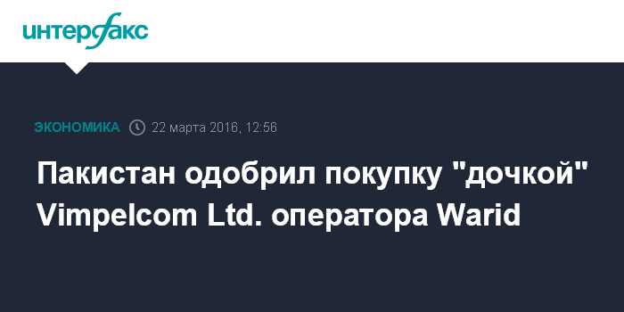 Москва. 22 марта. INTERFAX.RU - Комиссия по конкуренции Пакистана (CCP) одобрила сделку по приобретению мобильным оператором Mobilink, контролируемым Vimpelcom Ltd., 100% акций компании Warid.