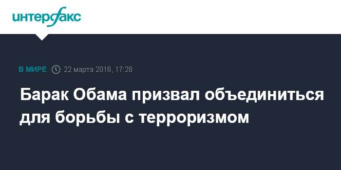 Москва. 22 марта. INTERFAX.RU - Президент США Барак Обама выразил во вторник солидарность с народом Бельгии, пострадавшим от терактов, и призвал мир объединиться для борьбы против терроризма.