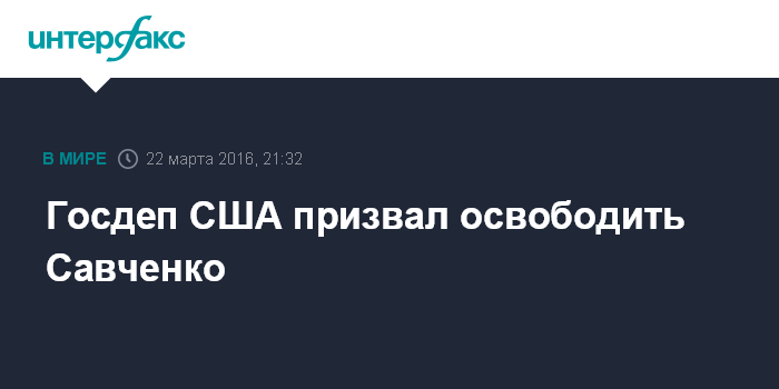 Москва. 22 марта. INTERFAX.RU - В госдепе США считают приговор к 22 годам колонии, вынесенный в РФ украинской летчице Надежде Савченко, пренебрежением принципами правосудия и призывают освободить ее, заявил во вторник представитель госдепартамента Джон Кирби.