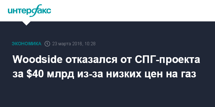 Москва. 23 марта. INTERFAX.RU - Австралийская нефтегазовая группа Woodside Petroleum отказалась от планов реализации проекта по сжижению газа Browse стоимостью 40 млрд долларов из-за обвала цен на энергоносители, пишет Financial Times.