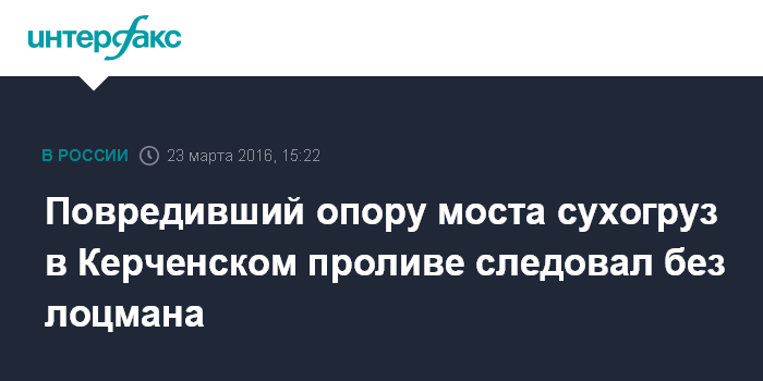 Москва. 23 марта. INTERFAX.RU - Сухогруз "Лира", повредивший в ночь на 20 марта одну из опор рабочего моста через Керченский пролив, следовал без лоцмана и своевременно не отреагировал на команду диспетчера о необходимости изменения опасного курса, сообщил "Интерфаксу" информированный источник.
