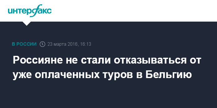 Москва. 23 марта. INTERFAX.RU - Туристы не аннулируют забронированные туры в Бельгию, но и новых заявок на поездки туроператоры не получают, сообщила "Интерфаксу" в среду пресс-секретарь Российского союза туриндустрии (РСТ) Ирина Тюрина.