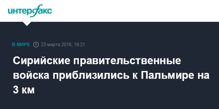Москва. 23 марта. INTERFAX.RU - Военнослужащие армии Сирии продолжают продвижение к удерживаемому террористами из группировки "Исламское государство" (запрещена в РФ) городу Пальмира, сообщает агентство Associated Press.