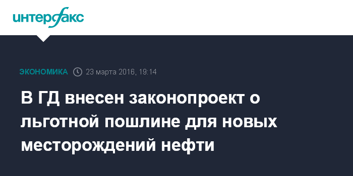 Москва. 23 марта. INTERFAX.RU - Правительство РФ внесло в Госдуму законопроект о применении льготной экспортной пошлины на сверхвязкую нефть для месторождений, введенных в разработку не ранее 1 января 2016 года. Текст документа опубликован в электронной базе документов нижней палаты парламента.