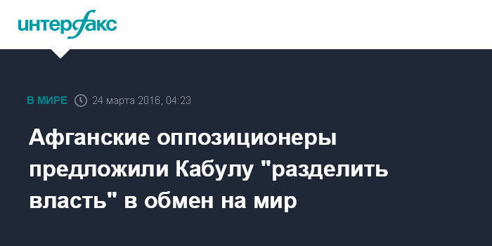 Москва. 24 марта. INTERFAX.RU - Исламская партия Афганистана ("Хезб-и-Ислами"), представляющая полевого командира Гульбуддина Хекматияра, предложила официальному Кабулу "разделить власть" в обмен на мир, сообщают афганские СМИ со ссылкой на Высший совет мира Афганистана