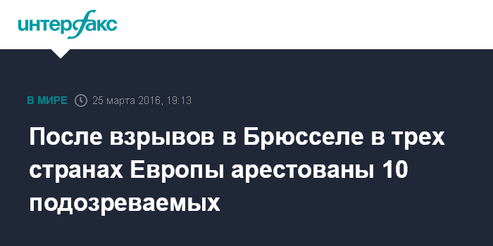 Москва. 25 марта. INTERFAX.RU - Десять человек арестованы в трёх европейских странах после серии терактов в Брюсселе, сообщает в пятницу "Би-би-си".