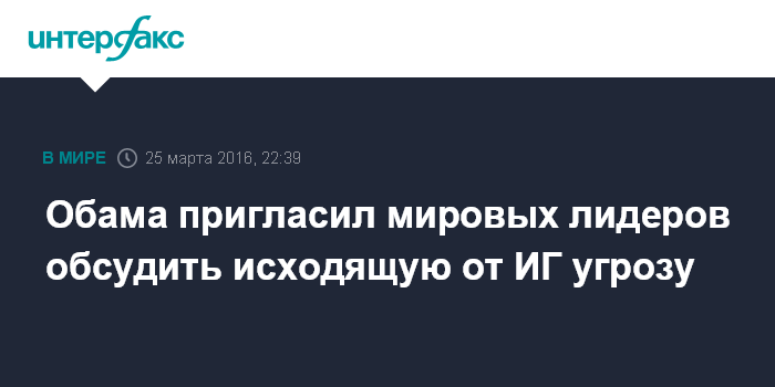 Москва. 25 марта. INTERFAX.RU - Президент США Барак Обама намерен на следующей неделе в Вашингтоне обсудить с рядом мировых лидеров угрозы, связанные с действиями террористической группировки ИГ (запрещена в РФ), пишет в пятницу газета Wall Street Journal со ссылкой на неназванные американские официальные лица.