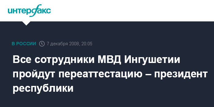 Назрань. 7 декабря. ИНТЕРФАКС-ЮГ - Все сотрудники органов внутренних дел Ингушетии, начиная с руководящего состава и кончая рядовыми милиционерами, пройдут аттестацию на соответствие занимаемым должностям, заявил президент республики президент Юнус-Бек Евкуров.