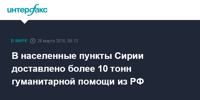 Москва. 26 марта. INTERFAX.RU - Новая партия российской гуманитарной помощи доставлено в населенные пункты сирийской провинции Хама, ранее осажденные и захваченные террористами запрещенной в РФ "Джебхат ан-Нусры".