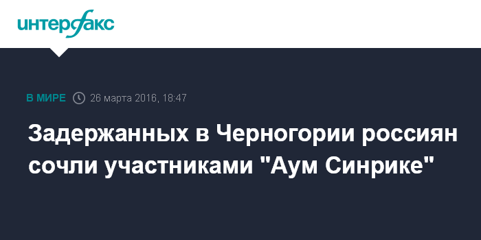 Москва. 26 марта. INTERFAX.RU - Задержанные накануне в Черногории россияне оказались членами японской террористической секты "Аум Синрике", устроившей газовую атаку в токийском метро в 1995 году. Об этом сообщает местное издание Vijesti. Полиция страны пока не дает официальных комментариев по поводу проведенной операции.