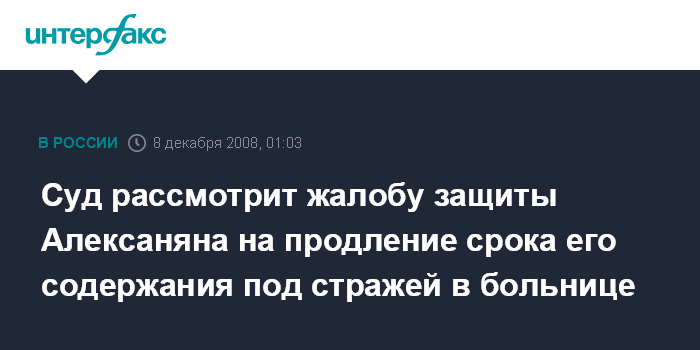 Москва. 8 декабря. ИНТЕРФАКС - Мосгорсуд рассмотрит в понедельник жалобу защиты бывшего вице-президента НК "ЮКОС" Василия Алексаняна на продление до 22 января срока его содержания под стражей в больнице.