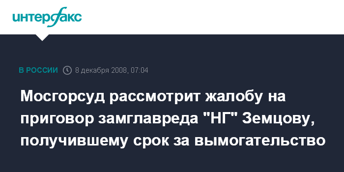 Москва. 8 декабря. ИНТЕРФАКС - Мосгорсуд вернется к рассмотрению жалобы защиты на приговор заместителю главного редактора "Независимой газеты" Борису Земцову, осужденному на 8 лет заключения за вымогательство.