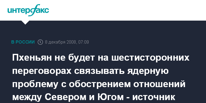 Пхеньян не будет на шестисторонних переговорах связывать ядерную проблему с обострением отношений между Севером и Югом - источник