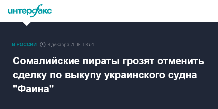 Москва. 8 декабря. INTERFAX.RU - Сомалийские пираты крайне недовольны задержкой выкупа за украинское судно "Фаина" с вооружением на борту, сообщил телеканал "Вести-24".