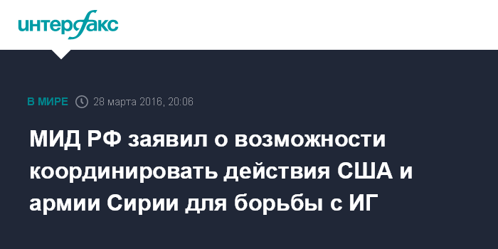 Москва. 28 марта. INTERFAX.RU - В Москве допускают координацию США и Сирийской армии по вопросу освобождения сирийских Дейр-эз-Зора и Ракки от "Исламского государства (запрещено в России), заявил замглавы МИД РФ Михаил Богданов.