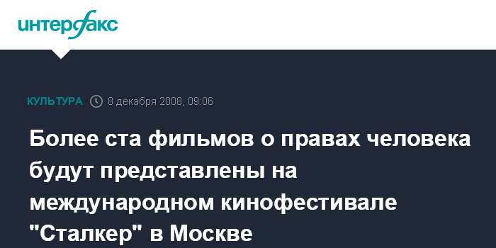 Москва. 8 декабря. INTERFAX.RU - XIV Международный фестиваль фильмов о правах человека "Сталкер" пройдет в Доме Кино Союза кинематографистов России в Москве с 10 по 15 декабря.