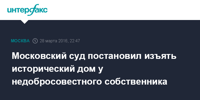 Москва. 28 марта. INTERFAX.RU - Арбитражный суд Москвы постановил изъять выявленный объект культурного наследия у недобросовестного собственника, сообщили "Интерфаксу" в пресс-службе Мосгорнаследия в понедельник.
