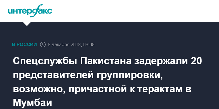 Спецслужбы Пакистана задержали 20 представителей группировки, возможно, причастной к терактам в Мумбаи