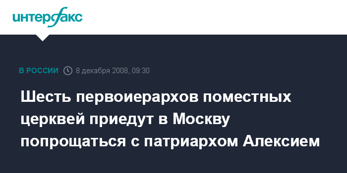 Москва. 8 декабря. INTERFAX.RU - На похороны патриарха Московского и всея Руси Алексия II прибудут шесть предстоятелей поместных православных церквей, сообщили порталу "Интерфакс-Религия" в Отделе внешних церковных связей Московского патриархата.