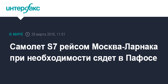 Москва. 29 марта. INTERFAX.RU - В настоящее время идет посадка на рейс Москва-Ларнака компании S7, самолет пока планирует приземлиться по месту назначения, но при необходимости готов сесть в Пафосе, сообщил "Интерфаксу" представитель авиаперевозчика.