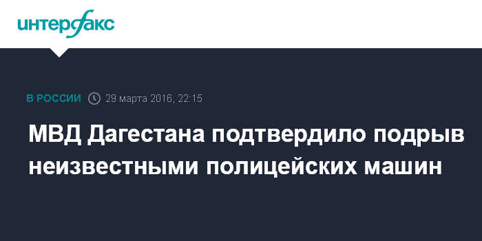 Москва. 29 марта. INTERFAX.RU - Неизвестные подорвали два автомобиля МВД России в Дагестане, сообщили "Интерфаксу" в пресс-службе МВД по Республике Дагестан.