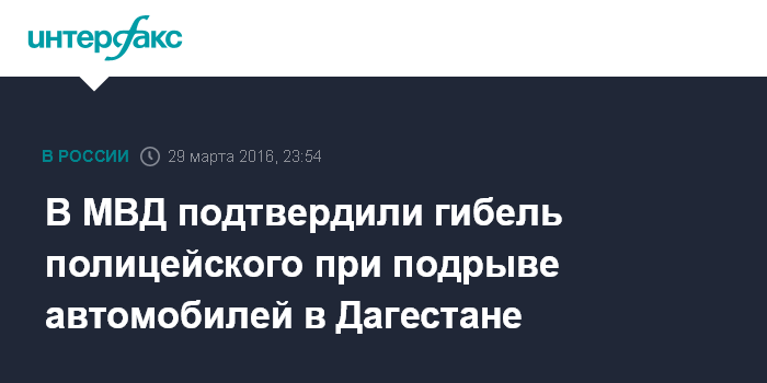 Москва. 29 марта. INTERFAX.RU - МВД России подтверждает факт гибели сотрудника полиции и ранения еще двух при подрыве автомобилей ведомства в Дагестане, сообщили "Интерфаксу" в пресс-службе регионального МВД.