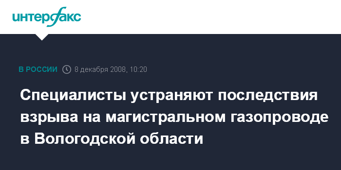 Москва. 8 декабря. INTERFAX.RU - Ремонтные бригады ведут работы на магистральном газопроводе высокого давления "Грязовец - Санкт-Петербург" в Вологодской области, где в субботу произошел взрыв, сообщили "Интерфаксу" в региональном МЧС.