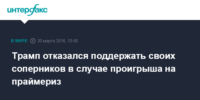 Москва. 30 марта. INTERFAX.RU - Участник президентской гонки в США миллиардер Дональд Трамп отказался от обещания поддержать кандидатуру любого из участников праймериз республиканцев в случае проигрыша, сообщают в среду американские СМИ.