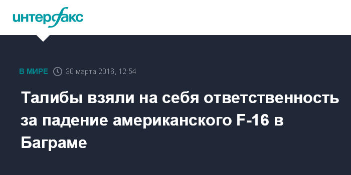 Москва. 30 марта. INTERFAX.RU - Потерпевший накануне крушение в районе авиабазы Баграм истребитель ВВС США F-16 был сбит боевиками группировки "Талибан" (запрещена РФ), сообщают в среду афганские СМИ со ссылкой на заявление экстремистов.