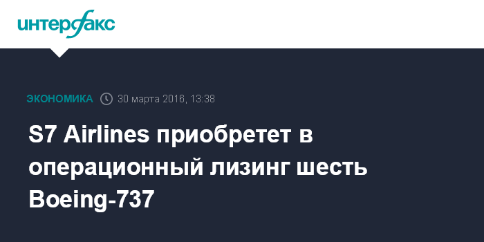 Москва. 30 марта. INTERFAX.RU - Авиакомпания "Сибирь" (бренд S7 Airlines) взяла в операционную аренду шесть самолетов Boeing-737-800, первые четыре уже поставлены, говорится в сообщении авиакомпании.