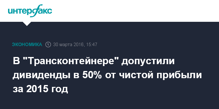 Москва. 30 марта. INTERFAX.RU - Руководство ПАО "Трансконтейнер" допускает выплату в качестве дивидендов по итогам работы компании в 2015 году не менее 50% от чистой прибыли по РСБУ.