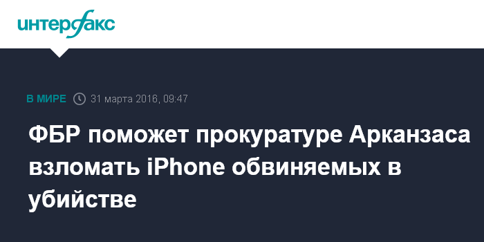 Москва. 31 марта. INTERFAX.RU - Специалисты ФБР согласились помочь прокуратуре штата Арканзас взломать смартфоны iPhone двух обвиняемых по делу об убийстве семейной пары, передает "Би-би-си".