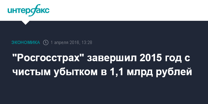 Москва. 1 апреля. INTERFAX.RU - ПАО "Росгосстрах" получило в 2015 году чистый убыток в размере 1,15 млрд рублей против чистой прибыли годом ранее в размере 871,5 млн рублей, следует из отчетности страховщика по РСБУ.