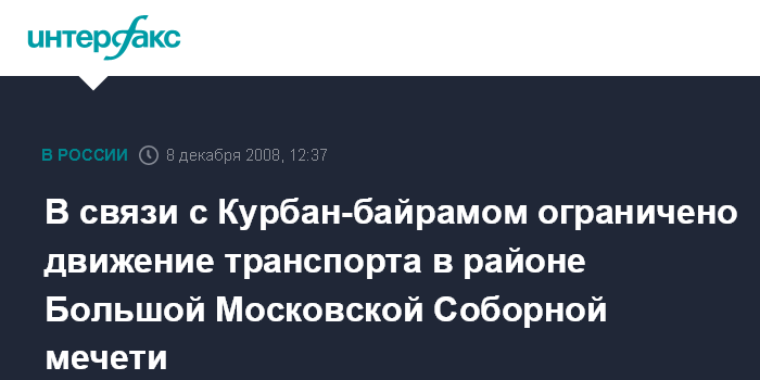 Москва. 8 декабря. INTERFAX.RU - В связи с празднованием главного исламского праздника Курбан-байрам в понедельник временно ограничено движение транспорта в районе Московской Большой Соборной мечети, сообщили "Интерфаксу" в отделе пропаганды безопасности дорожного движения управления ГИБДД столицы.