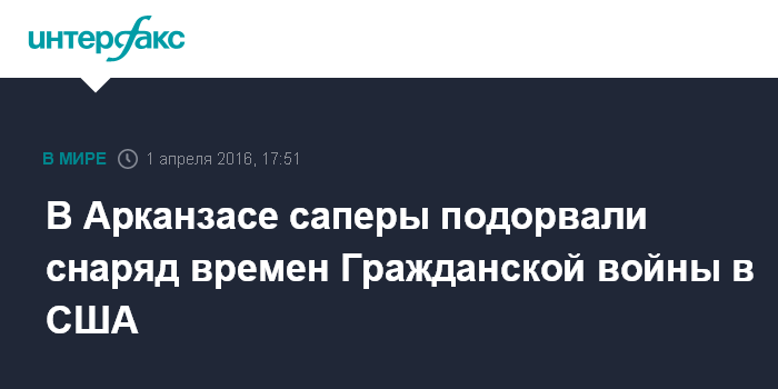 Москва. 1 апреля. INTERFAX.RU - Двадцать домов пришлось эвакуировать в американском штате Арканзас для обезвреживания снаряда времён Гражданской войны, сообщает в пятницу агентство AP.