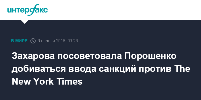 Москва. 3 апреля. INTERFAX.RU - Официальный представитель МИД России Мария Захарова предложила президенту Украины Петру Порошенко потребовать включения американской газеты The New York Times в санкционный список из-за статьи с нелестными высказываниями о киевских властях, в которой поднимается проблема коррупции.