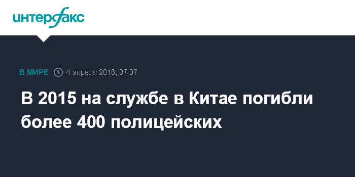 Москва. 4 апреля. INTERFAX.RU - При исполнении служебных обязанностей 438 сотрудников полиции погибли в Китае в 2015 году, еще 4 тыс. 599 полицейских получили ранения, сообщает в понедельник министерство общественной безопасности Китая на своем сайте.