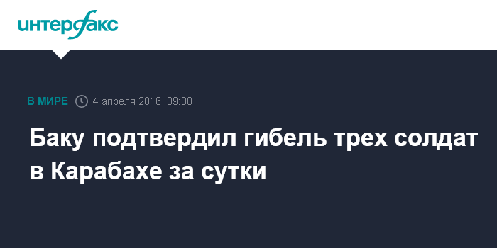 Москва. 4 апреля. INTERFAX.RU - Трое азербайджанских военнослужащих погибли за прошедшие сутки в зоне боевых действий на карабахском фронте, сообщает в понедельник Министерство обороны Азербайджана.