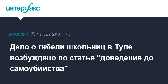 Москва. 4 апреля. INTERFAX.RU - Следственное управление СКР по Тульской области по результатам проведенной доследственной проверки возбудило уголовное дело по факту самоубийства двух 13-летних девочек в Туле, сообщила пресс-служба ведомства.