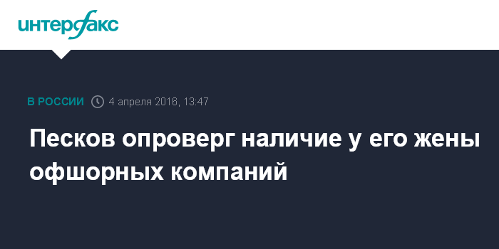 Москва. 4 апреля. INTERFAX.RU - Пресс-секретарь президента РФ Дмитрий Песков после публикации Международного консорциума журналистских расследований опроверг информацию о том, что у его супруги Татьяны Навки были или есть офшорные компании.