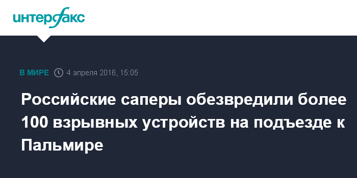 Москва. 4 апреля. INTERFAX.RU - Саперы из РФ в Сирии обезвредили более 120 взрывных устройств на дорогах, ведущих к исторической части Пальмиры.
