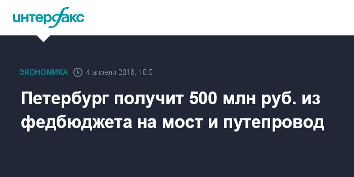 Москва. 4 апреля. INTERFAX.RU - Власти Петербурга в рамках межбюджетных трансфертов получат из федерального бюджета 500 млн рублей на строительство моста и путепровода через железнодорожные пути на юге города, сообщил председатель городского комитета по развитию транспортной инфраструктуры (КРТИ) Сергей Харлашкин в ходе заседания транспортного совета Петербурга в понедельник.