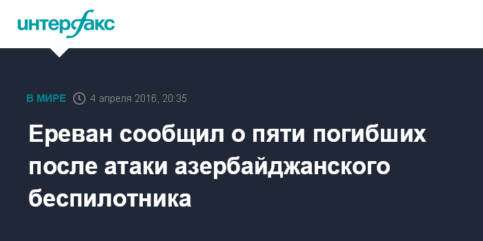 Москва. 4 апреля. INTERFAX.RU - Азербайджанский боевой беспилотный летательный аппарат вечером в понедельник нанес удар по автобусу с армянскими добровольцами, жертвами атаки стали пять человек, сообщил "Интерфаксу" пресс-секретарь министра обороны Армении Арцрун Ованнисян.