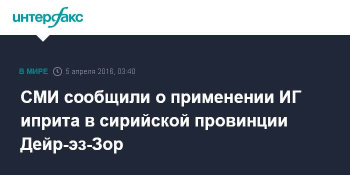 Москва. 5 апреля. INTERFAX.RU - При атаках на военный аэродром в сирийской провинции Дейр-эз-Зор боевики "Исламского государства" (ИГ, запрещенная в РФ террористическая организация) применили ракеты с отравляющим веществом иприт, сообщил государственный телеканал Сирии Ikhbariyah.