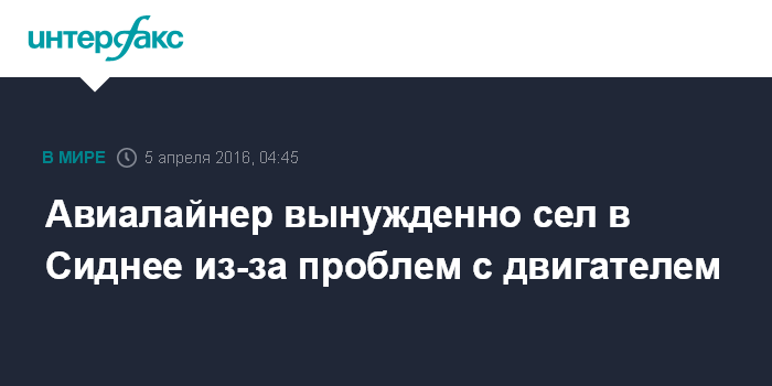 Москва. 5 апреля. INTERFAX.RU - Самолет А-380 австралийской авиакомпании Qantas произвел вынужденную посадку в Сиднее из-за проблем с двигателем, сообщил представитель авиакомпании.