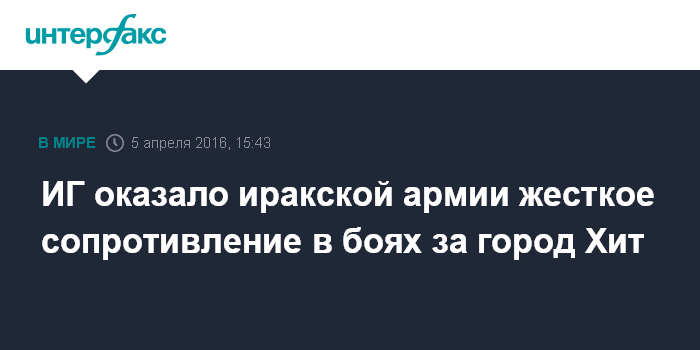 Москва. 5 апреля. INTERFAX.RU - Иракские вооруженные силы столкнулось с мощным сопротивлением боевиков запрещенной в РФ группировки "Исламское государство" в ходе операции по освобождению города Хит на западе Ирака, сообщает агентство Associated Press.