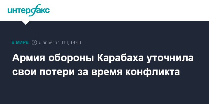 Москва. 5 апреля. INTERFAX.RU - Потери Армии обороны Нагорного Карабаха в результате боев в зоне карабахского конфликта составили 29 военнослужащих, заявил на пресс-конференции в Степанакерте начальник оперативного отдела Армии обороны непризнанной НКР, полковник Виктор Арстамян.