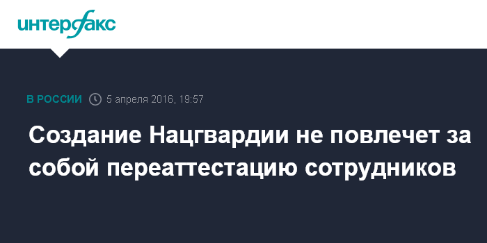 Москва. 5 апреля. INTERFAX.RU - Военнослужащим внутренних войск и других подразделений, которые войдут в Нацгвардию, не придется проходить переаттестацию, говорится в указе президента РФ Владимира Путина, опубликованном сегодня на сайте Кремля.