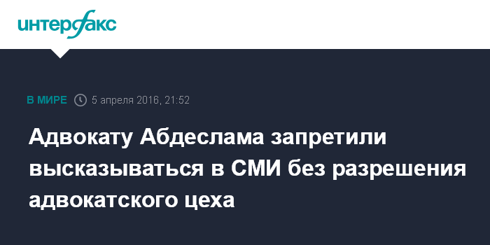 Москва. 5 апреля. INTERFAX.RU - Адвокат Салаха Абдеслама, основного подозреваемого в причастности к терактам в Париже 13 ноября, Свен Мари не может больше высказываться в прессе по теме этих атак без предварительного разрешения совета адвокатов.